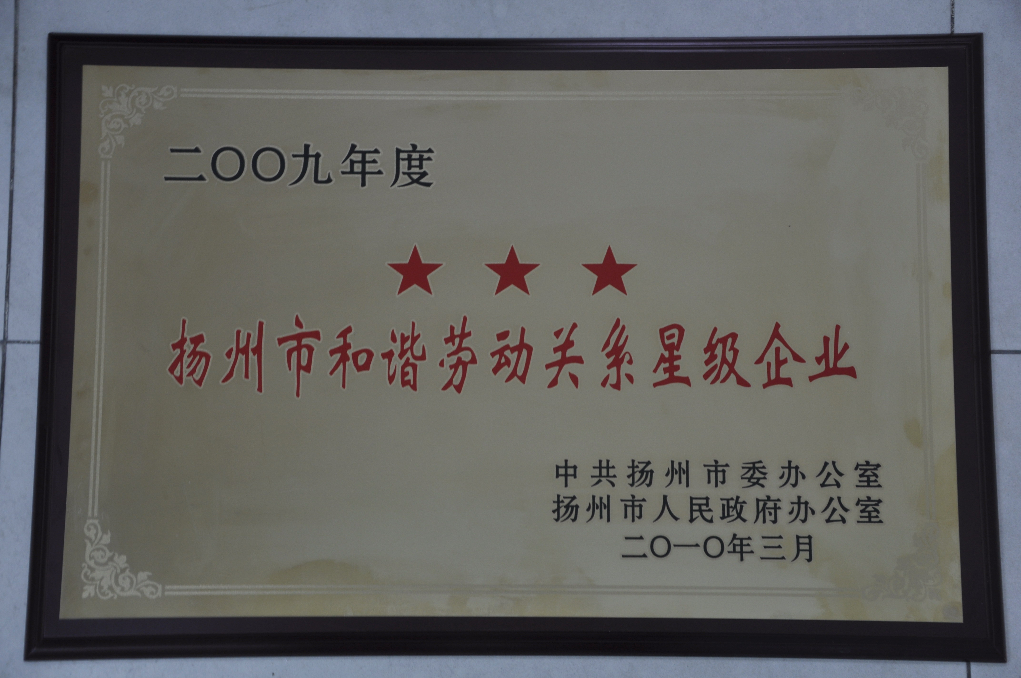 > 集團(tuán)公司獲2009年揚(yáng)州市和諧勞動(dòng)關(guān)系“三星級(jí)企業(yè)”殊榮