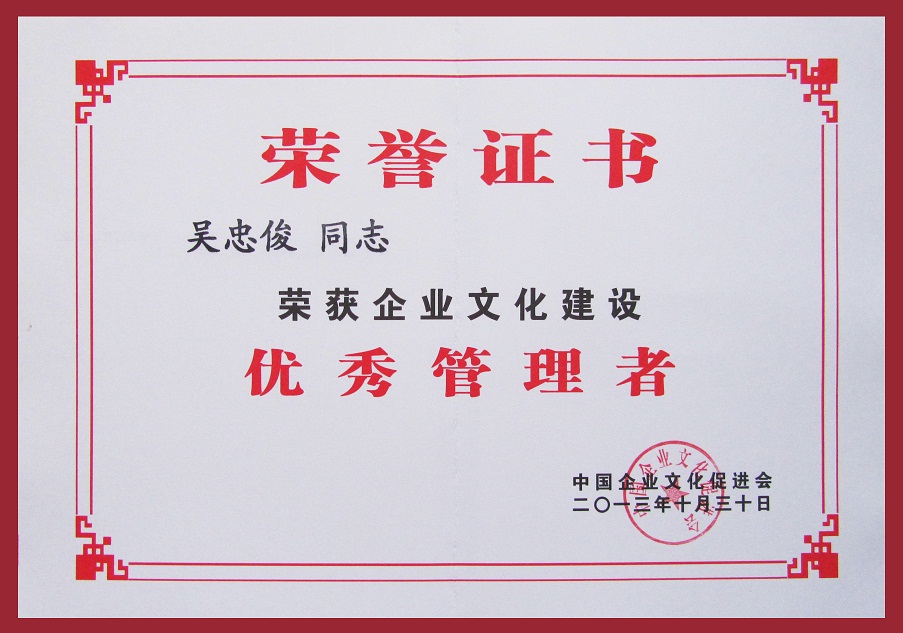 集團(tuán)公司被授予“企業(yè)文化建設(shè)百佳單位”榮譽(yù)稱(chēng)號(hào);集團(tuán)公司總經(jīng)理、黨委書(shū)記吳忠俊被第四屆七次理事會(huì)選為中國(guó)企業(yè)文化促進(jìn)會(huì)副會(huì)長(zhǎng),并被評(píng)為“企業(yè)文化建設(shè)優(yōu)秀管理者”;集團(tuán)公司企業(yè)文化策劃處處長(zhǎng)俆世革被評(píng)為“企業(yè)文化建設(shè)先進(jìn)工作者”。我司在企業(yè)文化建設(shè)方面的成績(jī)得到了充分肯定。