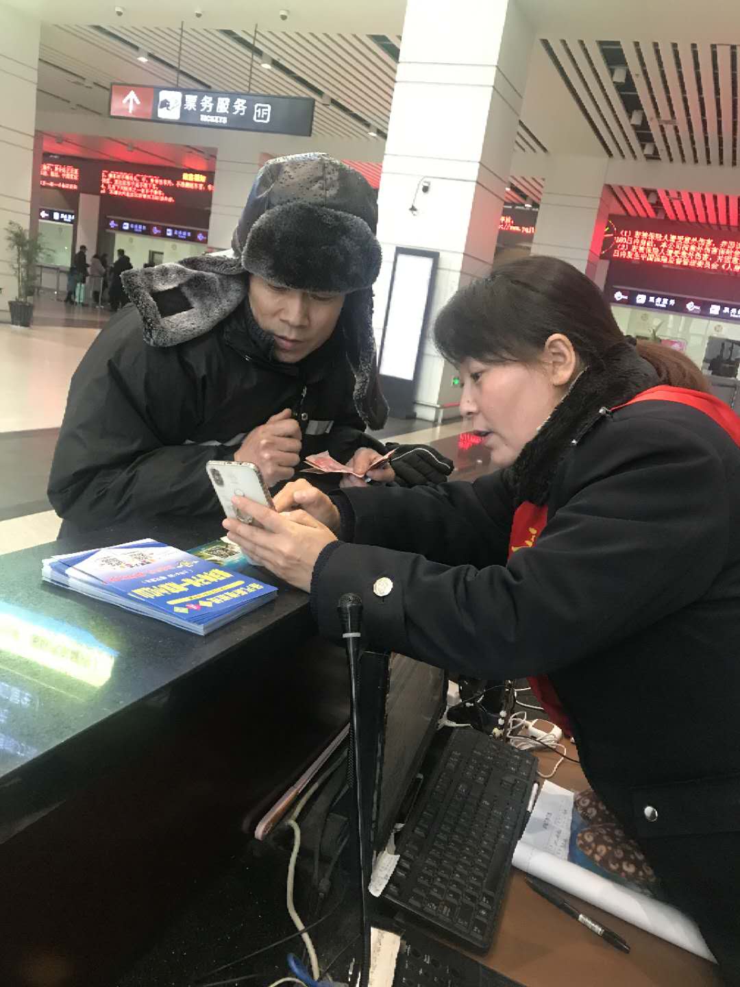 農(nóng)民工兄弟頂風(fēng)冒雨購票回家,站務(wù)員熱心相幫助他們返鄉(xiāng)